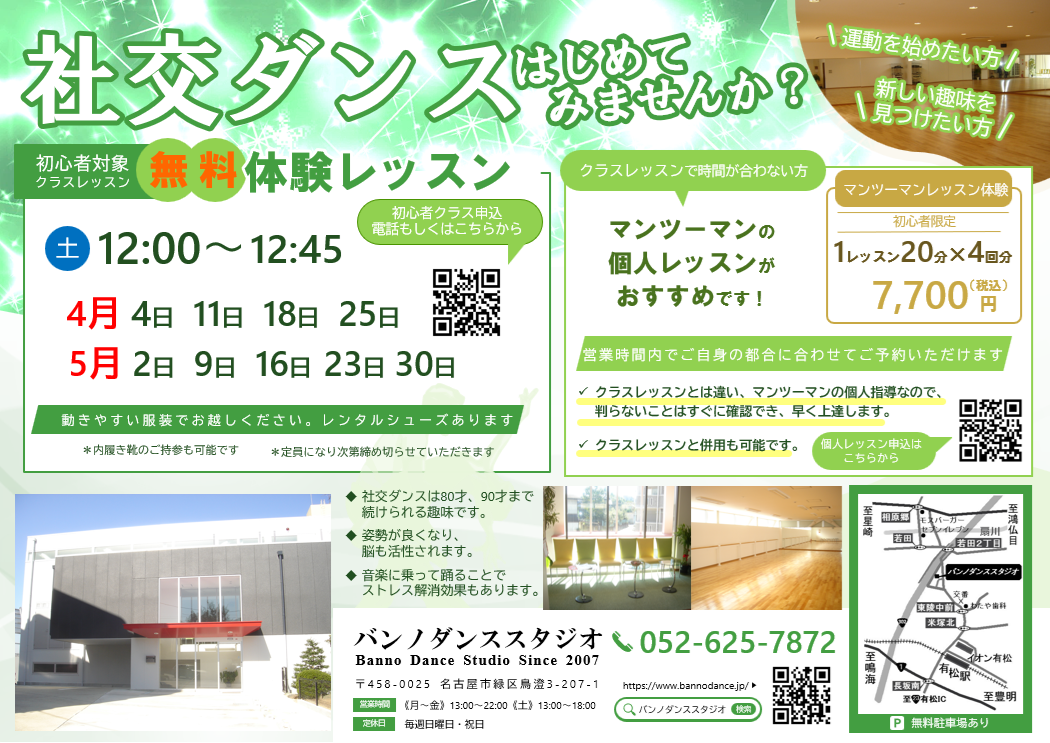 バンノダンススタジオは社交ダンススタジオとして名古屋市緑区に2007年6月にオープンしました。