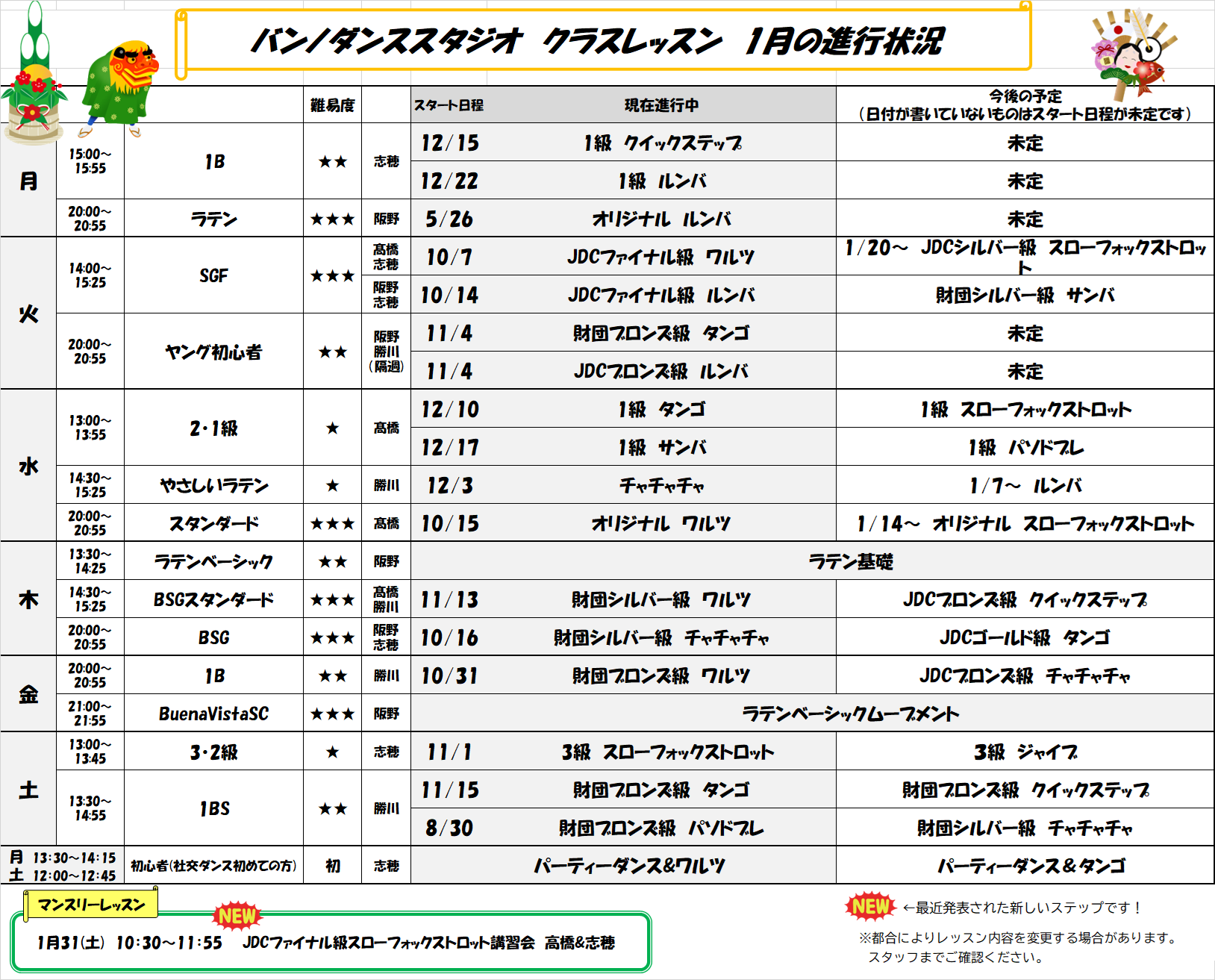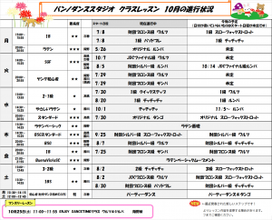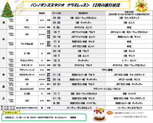 ※クラスレッスンは講師の都合により休講・時間変更する場合があります。スタジオ内掲示板・お電話にてご確認ください。
