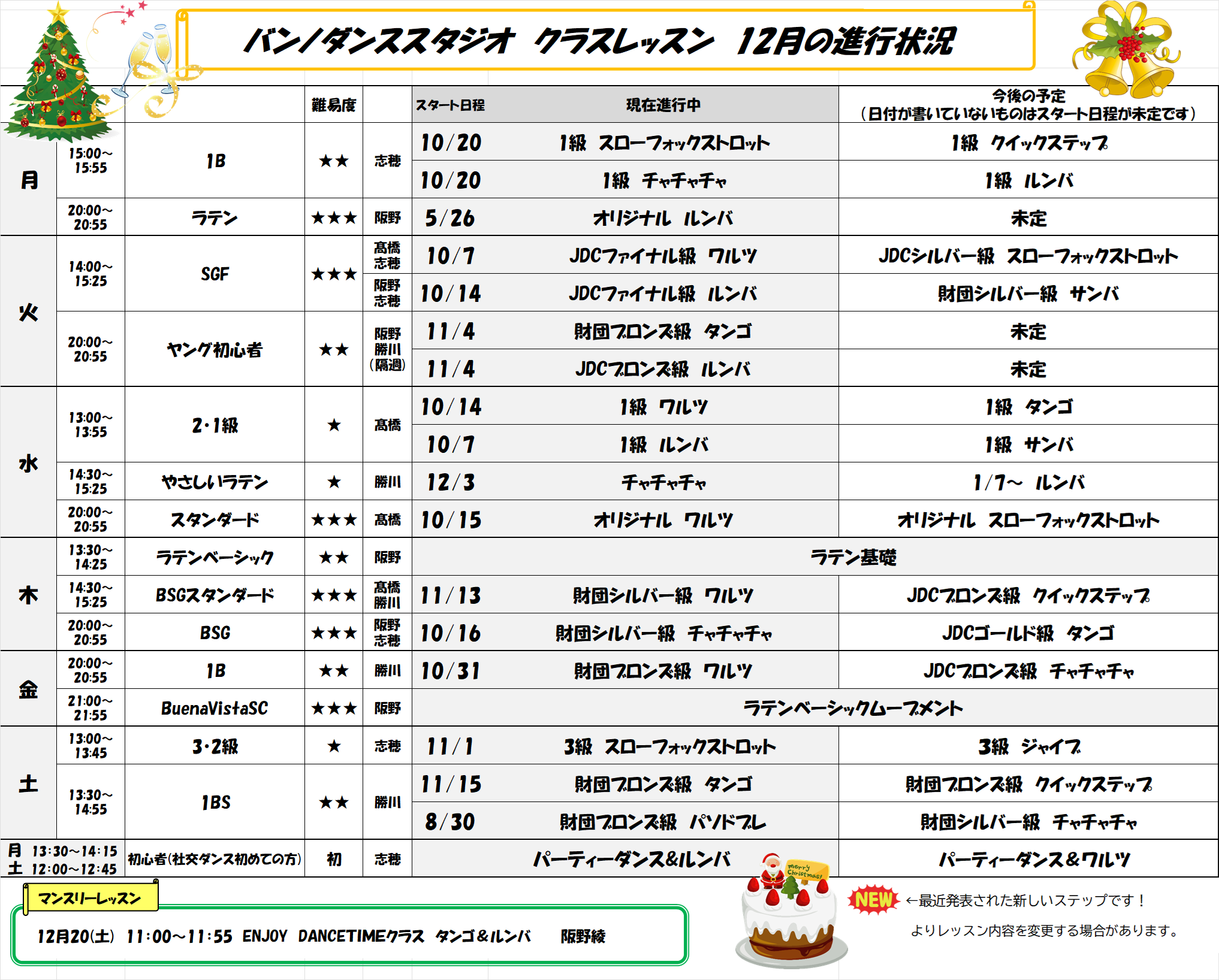 ※個人・カップルレッスンは営業時間内のいつでも予約できます。ご相談下さい。
